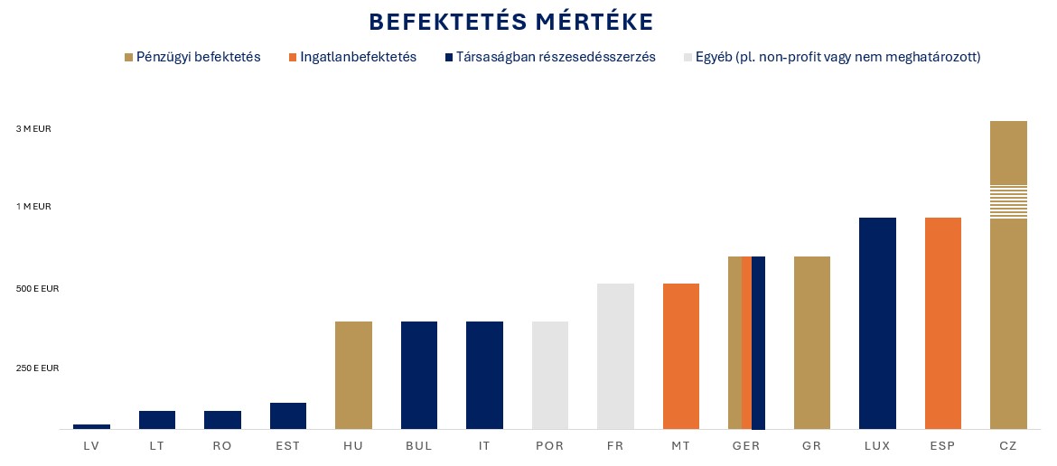 Az alábbi diagram a befektetés minimális mértékét szemlélteti országonként – feltüntetve a legalacsonyabb befektetési összegre jogosító befektetési forma típusát is.