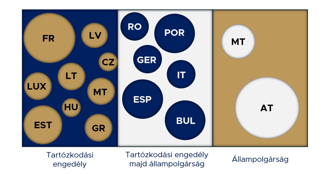 - A skála másik végén azok az országok vannak, amelyek kifejezetten gazdaságélénkítési és gazdagságfejlesztési céllal határoznak meg befektető-csábítási programokat. Ezekben a tartózkodási engedély megszerzésének sokszor nincsenek is előre meghatározott, egzakt feltételei, az adott ország diszkrecionális jogán múlik a kedvezmény megadása. Ebbe a kategóriába tartozik pl. Franciaország, Németország vagy Ausztria.