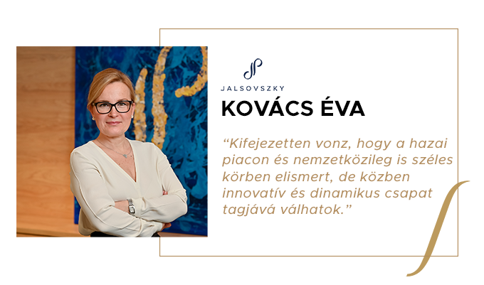 „Tapasztaljuk, hogy lassan újra éledezik az ingatlanpiac. Pont ez az az időszak, amikor egy új vezető igazi lendületet tud adni és lehetőségeket tud nyitni a praxisnak. Évával már több, mint 15 éve ismerjük egymást, tisztában vagyunk széleskörű tapasztalatával és üzleti szemléletével. Ez rendkívül megkönnyítette, hogy megtaláljuk a közös hangot és a közös célokat” – tette hozzá Jalsovszky Pál, az iroda vezetője.